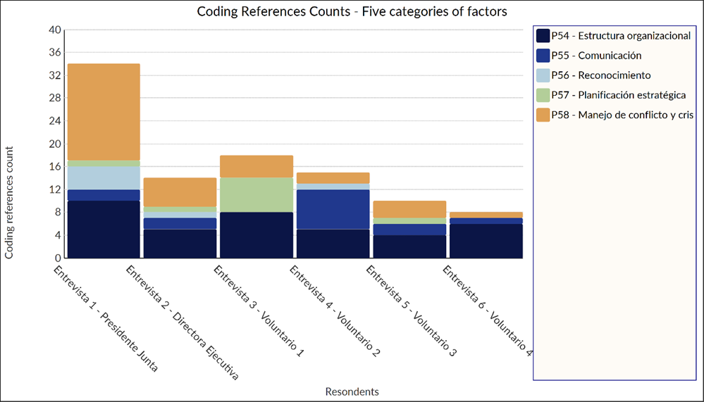 The most frequent words were codified by NVivo 12 and analyzed by the author. Data were categorized to identify factors that negatively impact stipend volunteers’ OC. Those factors were clustered in five main categories: organizational structure, communication, recognition, strategic planning, and conflict management. Figure 3 shows the five categories and their respective subcategories, as found in the data analysis.