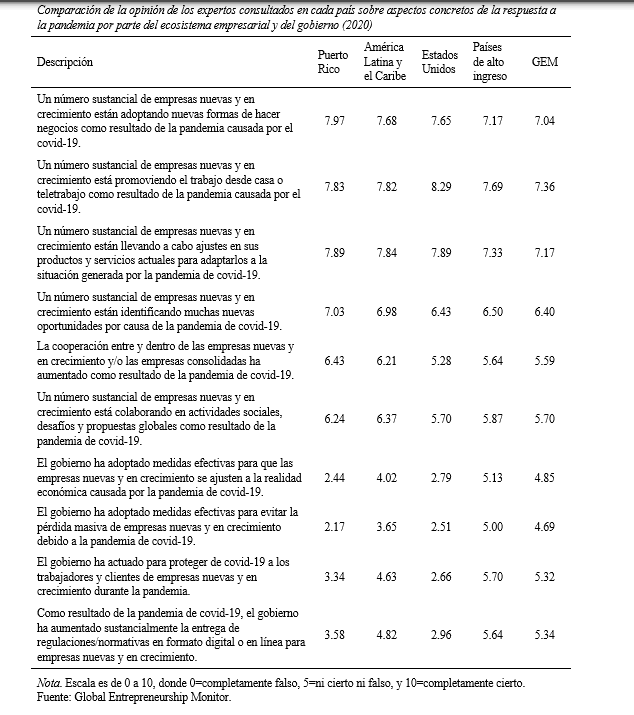 Global Entrepreneurship MonitorLa Tabla 2 ofrece detalles sobre los elementos que componen esta valoración de los expertos. En comparación con otros países, destaca la percepción positiva en Puerto Rico sobre la capacidad de las empresas a adaptar sus modelos de negocio a raíz de la pandemia, así como de cooperar entre ellas. En el lado negativo, no se percibe que el gobierno haya sido capaz de adoptar medidas efectivas para evitar cierres masivos de emprendimientos o para facilitar el ajuste de las empresas a la realidad impuesta por el covid-19.