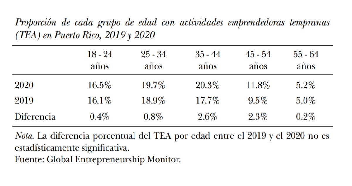 ¿Estamos en los albores de un salto cuantitativo en la actividad emprendedora en Puerto Rico? ¿Puede convertirse la pandemia en el detonante de una nueva etapa, una estructura económica definitivamente basada en la actividad de empresas locales? Álvarez et al. (2018) señalan con preocupación la distancia que hay en la isla entre el número de emprendimientos nacientes y el de emprendimientos nuevos, es decir, entre la proporción de la población que tiene intención e incluso da los primeros pasos para montar un negocio, y los que efectivamente empiezan a generar ingresos y pueden plantearse vivir de esa actividad. Esa brecha es mucho mayor en Puerto Rico que en cualquier otro país participante del GEM, y se ha mantenido o ampliado a lo largo de los años. Por tanto, este auge en intención de empezar un negocio podría no traducirse en un aumento correspondiente de empresas nuevas. En este sentido, debe señalarse además que el 58 por ciento de las personas que iniciaron emprendimientos en Puerto Rico en 2020 percibían que se había vuelto mucho más difícil empezar un negocio propio, una percepción que compartían el 75 por ciento de los dueños de empresas establecidas (entre el conjunto de los países participantes las proporciones fueron 58% y 63%, respectivamente, en promedio). En la misma línea, el 74 por ciento de los emprendedores nacientes indicaron que la pandemia implicó una demora en el proceso de tener el negocio operacional (69% en promedio entre los participantes del GEM).