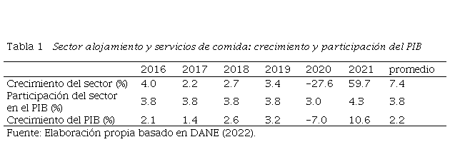 El servicio de alojamiento en hoteles es parte de la cadena del sector turismo, uno de los sectores que genera mayores divisas y del cual se tiene la mayor esperanza que sustituya aquellas que se dejarán de recibir por la reducción de la explotación petrolera en Colombia. En el sexenio evaluado se avizoran tres fases que marca el principal factor perturbador, el covid-19: el prepandémico (2016-2018), el pandémico (2019-2020) y el pospandémico (2021). En la primera fase se observa que la ocupación hotelera crece al pasar de 55.7% en el 2016 a 56.0% en el 2017 y 56.3% en el 2018; en la segunda decrece con un 48.8% en el 2019 y 25.1% en el 2020, y en la tercera se recupera con un 40.7% (Sectorial, 2021 y 2022). Indudablemente la pandemia ha afectado el crecimiento y desempeño financiero del hotel promedio colombiano, que se analiza en este artículo.