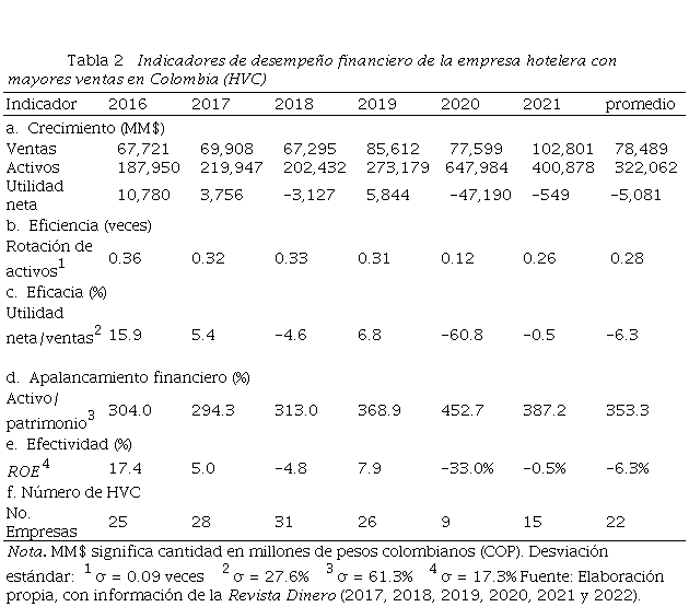 Los indicadores de desempeño financiero de un promedio de 22 empresas hoteleras con mayores ventas en Colombia (HVC) entre 2016 y 2021, fueron hallados y organizados de las ediciones anuales especiales tituladas “Ranking de las cinco mil empresas” de la Revista Dinero entre el 2016 y 2021, cuyos resultados se exhiben en la Tabla 2.