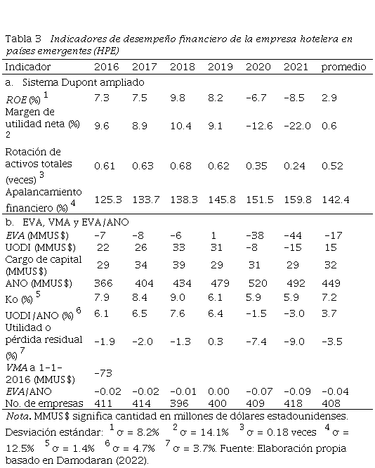 De Damodaran (2022) se consiguió información de un promedio de 408 empresas hoteleras en países emergentes (HPE) entre el 2016 y el 2021, con la cual se preparó los indicadores que se presentan en la Tabla 3.