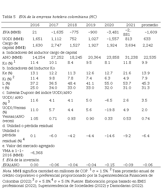 La investigación muestra que la empresa hotelera colombiana destruyó valor económico agregado en el sexenio 2016-2021 porque, salvo el 2016, la utilidad operacional después de impuestos fue inferior al costo de capital. Estos resultados fueron respaldados por algunos indicadores promedio de desempeño financiero de origen contable, como utilidad neta, el margen de utilidad neta y el ROE que fueron negativos, pero no así por el margen de utilidad operacional y el ROA que fueron positivos, lo que justificó su evaluación con indicadores de gestión del valor.