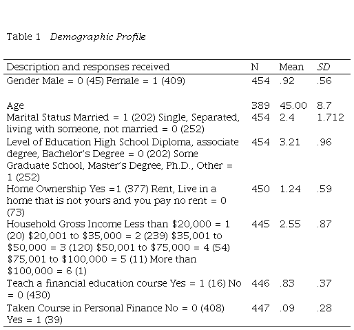 Table 1 describes the respondents based on their demographic attributes. The gender distribution consisted primarily of women (90%). The average age of the respondents was 45 years (Standard Deviation = 8.7), slightly less than half (44%) were married, and 84% owned their own homes. Slightly more than half (53%) have pursued graduate-level education. Although the gross household income fluctuated between $20,000 or less to over $100,000, 85.2% of the participants earned $50,000 or less. A significant majority (87%) of Puerto Rico's municipalities were represented in the training program. Only 39 of the 447 respondents (8.7%) have taken a course in personal finance, and only 16 of 446 respondents (3.5%) have taught a personal finance course.