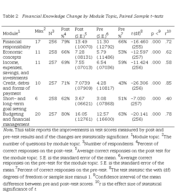The responses from the 267 participants whose pre and post-tests were matched through the assigned codes were analyzed via a paired-sample t-test to measure the change in financial knowledge and determine whether the observed change is significant. We observed a significant improvement in the level of financial knowledge after taking the personal finance workshops and participating in the group discussions. The average pre-test score was 66%, and the post-test average was 71%. On average, the participants obtained a significantly higher grade on the post-test (M = 71.23, S.E. = 0.009) than on the pre-test (M = 65.89, S.E. = 0.007, . (266) = -5.222, p<.05, r = .30). Although the improvements in objective financial knowledge were statistically significant, the size effect, or standardized measure of the observed effect, (r =.30) is considered medium because it explains 9% of the variance (Field, 2005). An observed effect of r = .10 is considered small because it explains 1% of the total variance. An observed effect of r = 0.50 is considered a large effect since it explains 25% of the variance.