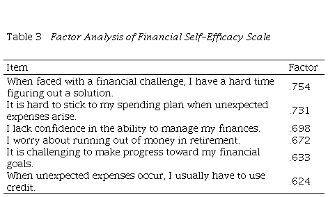 Financial literacy considers the combination of financial self-efficacy, financial behaviors, and subjective financial knowledge. The loading for the financial behaviors factor was .813, the loading for the financial self-efficacy factor was .799, and the loading for the financial knowledge factor was .790. The financial literacy scale contained only one factor which could not be rotated. This factor accounted for 64.15% of the variance in the responses. The scale's reliability is strong as measured by Cronbach's alpha (α = .72). This is within generally accepted parameters for scales, even considering it includes three items (Webb, 2011). The measurement sampling adequacy, the KMO index, is calculated to be .68.