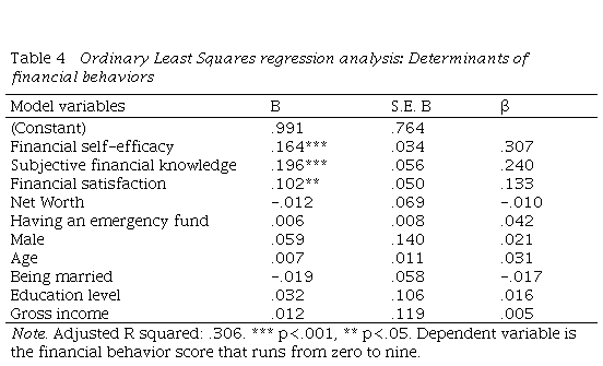 Financial behaviors are an important financial literacy component, as behaviors reflect short-term decision-making (Fernandes et al., 2014). The financial behavior score for each participant is the sum of the responses, ranging from zero to nine. We perform an OLS regression analysis to identify possible determinants of financial behaviors among the participants. The dependent variable is the financial behavior score, and the independent variables include financial self-efficacy, subjective financial knowledge, financial satisfaction, net worth, existence of an emergency fund, gender, age, civil status, level of education and gross income. The p values for each of these 10 coefficients tell us whether the relationships are statistically significant predictors of financial behaviors.