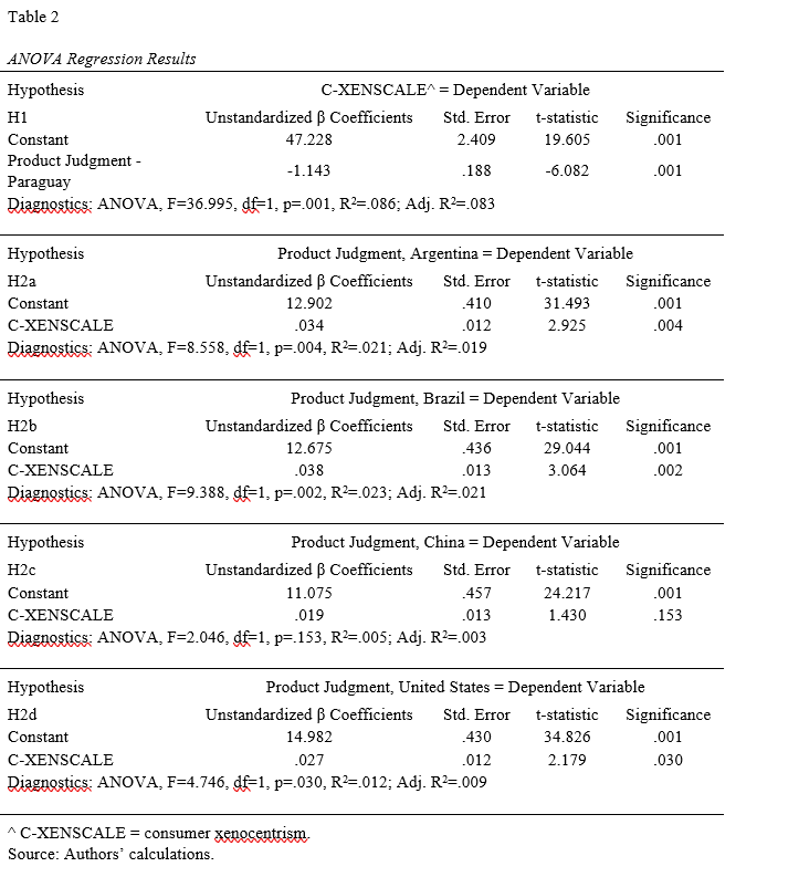 We utilize statistical procedures to assess the relationship between variables presented in Figure 1. We estimate H1, the relationship between product judgment of Paraguayan products with consumer xenocentrism, through an analysis of variance (ANOVA). The same procedure is used to estimate H2a-d. The coding of each variable is the summation of the answers to the questions in each psychometric scale.