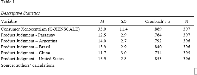 The descriptive statistics for the variables in the conceptual model appear in Table 1. The variables are derived from the psychometric scales answered by our survey respondents. Scale reliability is confirmed by the Cronbach alpha score of each scale and is within acceptable parameters (Hair et al., 1995). The mean C-XENSCALE score for respondents is 33.0, just below the 35 midpoint of the consumer xenocentrism scale. The product judgment means indicate a definite order, with China ranked lowest and the United States highest. Paraguayans rank their own products below that of Argentina and Brazil but ahead of products from China.