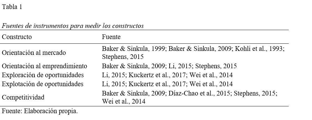 El instrumento de investigación que se utilizó es un cuestionario estructurado con una escala Likert de 7 puntos. Las preguntas incluidas en el cuestionario fueron extraídas de instrumentos utilizados y probados en la literatura para medir constructos similares. Las fuentes principales de instrumento para cada constructo son: Kohli et al. (1993) (orientación al mercado); Li (2015) (orientación al emprendimiento); Kuckertz et al. (2017) (exploración y explotación de oportunidades); y Díaz-Chao et al. (2015) (competitividad). Las preguntas fueron traducidas al español por los investigadores. La Tabla 1 incluye las fuentes que se tomaron como referencia para la construcción del instrumento con relación a cada constructo.