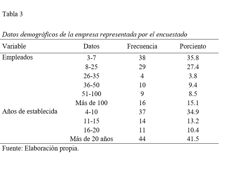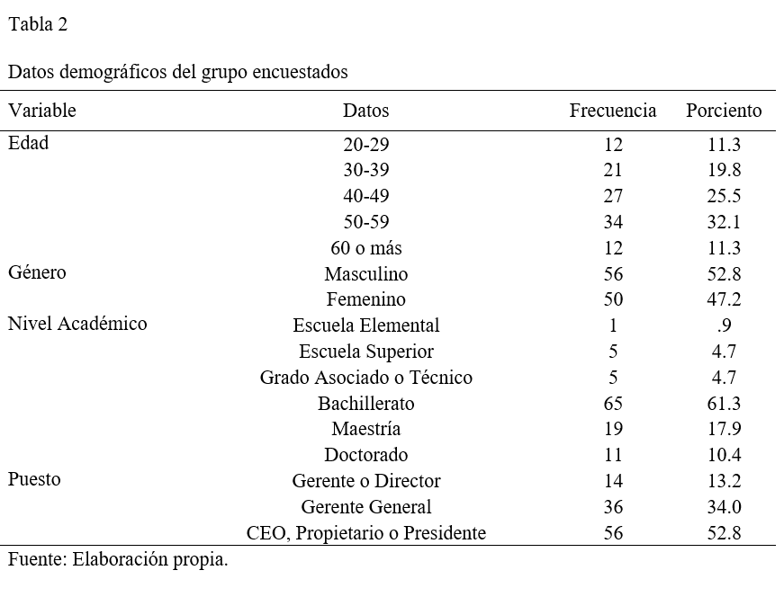 La Tabla 2 resume los datos demográficos (edad, género, nivel académico y puesto) de los propietarios y altos ejecutivos que fueron encuestados, mientras que la Tabla 3 resume los datos relacionados al tamaño y tiempo de la empresa.
