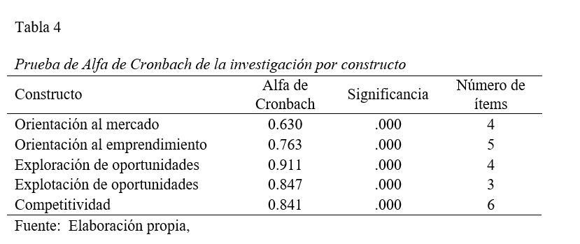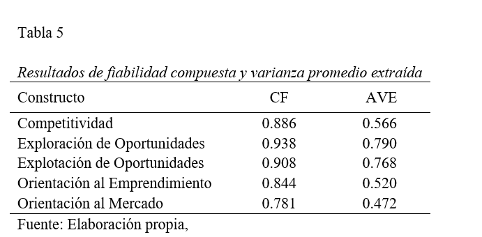Para probar las hipótesis establecidas del modelo conceptual (Figura 1), se realizó un análisis estadístico mediante la técnica multivariado de un análisis confirmatorio y para medir el modelo, se utilizó la teoría de medida reflectiva. Primeramente, el proceso de análisis incluye pruebas estadísticas para analizar cuán adecuados son los datos para realizar un análisis de factores. Después de realizar la validez de contenido del instrumento, se realizó la prueba de Kaiser-Meyer-Olkin con resultado de 0.873 y la prueba de esfericidad de Bartlett con significancia de 0.000. Estos resultados confirman que los patrones observados son conceptualmente válidos y apropiados para realizar un análisis de factores. Al finalizar varias iteraciones, la cantidad de variables se redujo a 22 de 48 ítems con una estructura de factores bien definida que incorporó cinco grupos distintos de variables que representan robustamente los constructos de este estudio. Por su parte, la prueba para determinar la confiabilidad del instrumento mediante la consistencia interna del instrumento, el Alfa de Cronbach, resultó en 0.911 para la totalidad del instrumento. La Tabla 4 muestra que el Alfa de Cronbach para cada constructo superó el nivel de aceptación de 0.70 con excepción de la orientación al mercado que resultó con 0.630 (Hair et al., 2010). Sin embargo, aunque generalmente el límite inferior aceptable para el Alfa de Cronbach es .70, puede bajar hasta .60 (moderado) (Hair et al., 2010). Como una medida diferente de confiabilidad de consistencia interna se calculó el índice de fiabilidad compuesta utilizando el programa Smart PLS, obteniendo valores entre 0.781 y 0.938 (Bagozzi & Yi, 1988; Hair Jr. et al., 2013; Wong, 2013). Se consideran como aceptables valores mínimos de 0.70 (Nunnally & Bernstein, 1995).