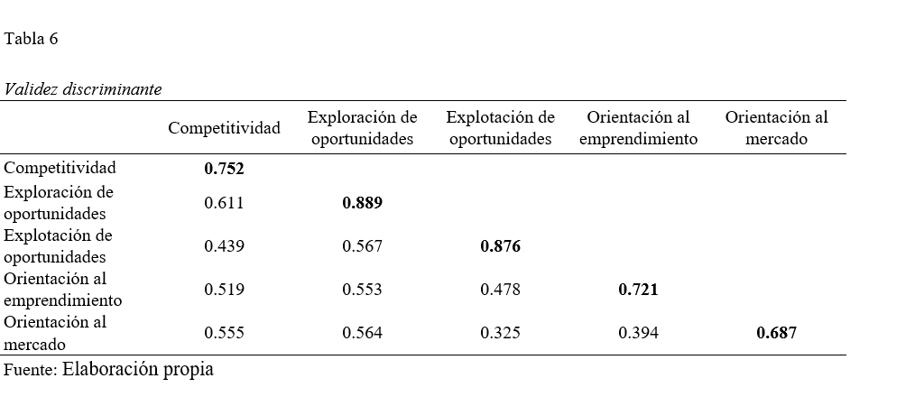 Para establecer la validez convergente, se consideró las cargas externas de los indicadores, así como la varianza promedio extraída (AVE) (Hair et al., 2022). En la Tabla 5 se puede observar que solo el constructo de orientación al mercado estuvo por debajo de 0.50 con un valor de 0.472. Sin embargo, según Fornell & Larcker (1981) y Huang et al. (2013), aunque la AVE debe ser mayor que 0.5, se pueden aceptar valores por encima de 0.4 si la confiabilidad compuesta (CR, por sus siglas en inglés) es mayor que 0.6. En el caso del constructo de orientación al mercado, la confiabilidad compuesta y el AVE resultaron en 0.781 y 0.472, respectivamente.