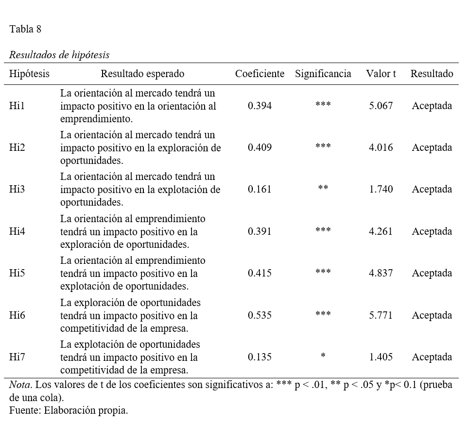 Los resultados del bootstrapping PLS llevan a la aceptación de todas las hipótesis. Todos los valores de t estadístico fueron mayores que 1.28. Las siete hipótesis fueron significativas y en consecuencia aceptadas (ver Tabla 8). Cuando el coeficiente tiene un valor de p menor a 0.10, la ruta puede considerarse significativa (Hair et al., 2015). Las rutas más destacadas son aquellas con valores de coeficientes más elevados, que incluyen: exploración de oportunidades a la competitividad, orientación al emprendimiento a la explotación de oportunidades, orientación al mercado a la exploración de oportunidades. Los valores de los coeficientes para las rutas mencionadas anteriormente fueron relativamente más altos que las otras vías admitidas. Las rutas menos destacadas fueron: la orientación al mercado a la explotación de oportunidades y la explotación de oportunidades a la competitividad de la empresa.