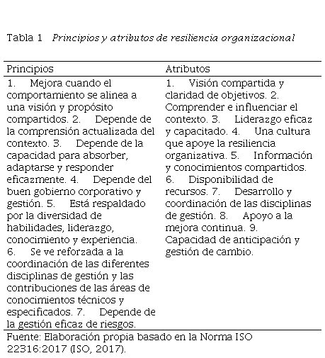 En 2017, surgió la Norma ISO 22316:2017 Seguridad y Resiliencia -Resiliencia organizacional -Principios y Atributos (Internarional Organization for Standardization [ISO], 2017), que ofrece una orientación sobre cómo abordar la resiliencia desde el contexto organizacional. Para ello, propone atributos y principios como pautas a seguir (Kohl, 2020). Dicha norma en México tiene una concordancia idéntica a la Norma Mexicana NMX-I-22316-NYCE-2021 Tecnologías de la información-Seguridad y Resiliencia -Resiliencia Organizacional- Principios y atributos, la cual se publicó en el Diario Oficial de la Federación (DOF) en el 2022. En la actualidad no existen estudios de resiliencia organizacional en el contexto turístico; de aquí que el presente estudio sería una contribución a la capacidad de resiliencia de las empresas a partir de los principios y atributos de la normatividad aplicable vigente.
