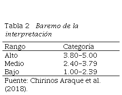 b) La percepción de principios y atributos de resiliencia se estableció por medio de una escala de Likert con los siguientes criterios: 1. Pésimo, 2. Malo, 3. Regular, 4. Bueno y 5. Excelente. Acto seguido, se establecieron parámetros para el baremo de interpretación de la media aritmética que se observa en la Tabla 2.