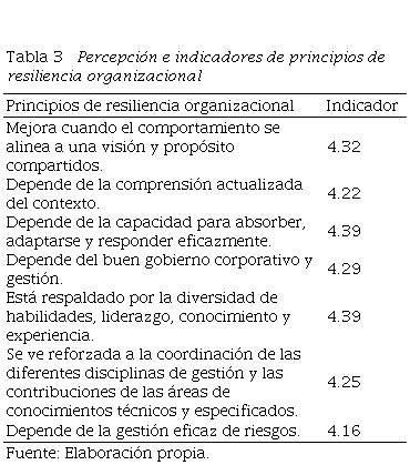 En las empresas del estudio se observó que, con relación a los principios de resiliencia, dos tuvieron un rango alto de 4.39. Estas fueron: a) depende de la capacidad de absorber, adaptarse y responder eficazmente y b) está respaldado por la diversidad de habilidades, liderazgo, conocimiento y experiencia. Por su parte, el área de oportunidad es la gestión eficaz de riesgos (4.16); sin embargo, en el barómetro la resiliencia desde la percepción de los principios fue alta como se observa en la Tabla 3.