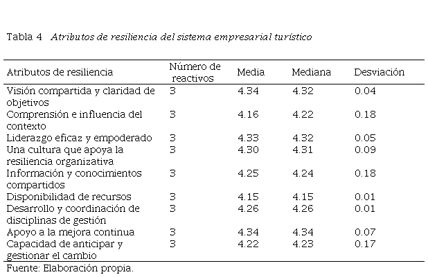 Sin embargo, todos los atributos están en un rango alto de resiliencia organizacional. Se puede apreciar que la desviación estándar más alta es de 0.18; los datos son homogéneos. En la Tabla 4 se describen los atributos de resiliencia organizacional.