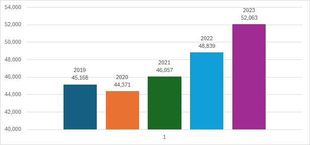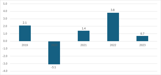Puerto Rico se encuentra en un periodo de crecimiento en la producción tras más de una década de depresión económica. Esa recuperación ha sido posible por la inyección de fondos públicos provenientes en su mayoría del Gobierno de EE. UU. por los huracanes, los terremotos y la pandemia. Como resultado, la Junta de Planificación de Puerto Rico reportó en el Apéndice Estadístico del Informe Económico al Gobernador aumentos en la producción en cuatro de los pasados cinco años (véase Figura 2). El único año en ese periodo que no hubo crecimiento económico fue en el 2020 por la pandemia. De hecho, a partir del 2021 (momento que se aprobó la Ley del Salario Mínimo de Puerto Rico) hasta el 2023 (último año para el cual hay datos disponibles), el Producto Nacional Bruto incrementó 6.0% y el gasto de consumo personal 10.0% (Junta de Planificación, 2023c).