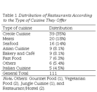 Before the pandemic, the derived weighted average of dollar sales among surveyed restaurants prior to the pandemic approximates USD 984,397. The culinary offerings of these restaurants encompass diverse cuisines, ranging from traditional "Comida Criolla" to exotic "Comida de la Selva." The distribution of restaurants based on their culinary focus is presented in Table 1. Under the "Mariscos" category, all restaurants specializing in seafood dishes are included.