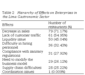 This study has yielded valuable evidence on the effects of the COVID-19 pandemic on the gastronomic sector in Lima, Peru. The foremost challenge identified because of that enormous crisis was a decrease in sales, coupled with reduced customer traffic and liquidity problems. This, in turn, triggered a contraction in hiring, with a 40% decline in the establishments studied.