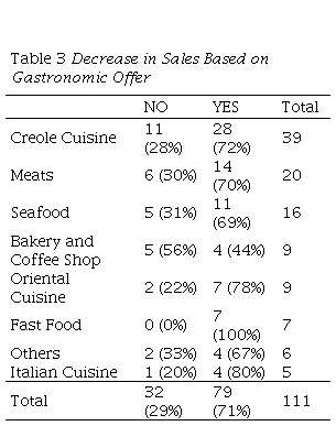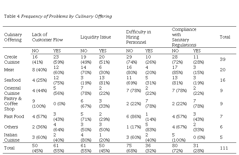 Regarding hiring difficulties, it can be observed that the culinary offering with the highest number of businesses experiencing hiring difficulties is Creole Cuisine, with ten businesses facing challenges. Out of the 111 businesses listed in Table 4, 36 encountered challenges in hiring personnel, accounting for 32% of the total businesses. These results suggest that personnel recruitment was also a common challenge in the gastronomic sector.