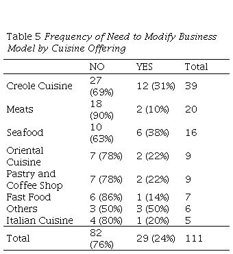 The results indicate that the necessity to modify the business model is less common compared to the issue of inadequate customer flow, though it remains relevant in some gastronomic establishments. As shown in Table 5, it can be observed that 74% of the analyzed gastronomic establishments (82 out of the sample) did not experience the need to modify their business model. Conversely, the cuisine category "Comida Criolla" demonstrated the highest occurrence of this requirement, with 12 cases (30%). Moreover, 37.5% of the seafood-focused establishments, called "Mariscos" (6 out of 16), experienced this necessity. The qualitative analysis delves into the strategies followed by entrepreneurs within the gastronomic sector due to the adaptations necessitated by their usual operations.