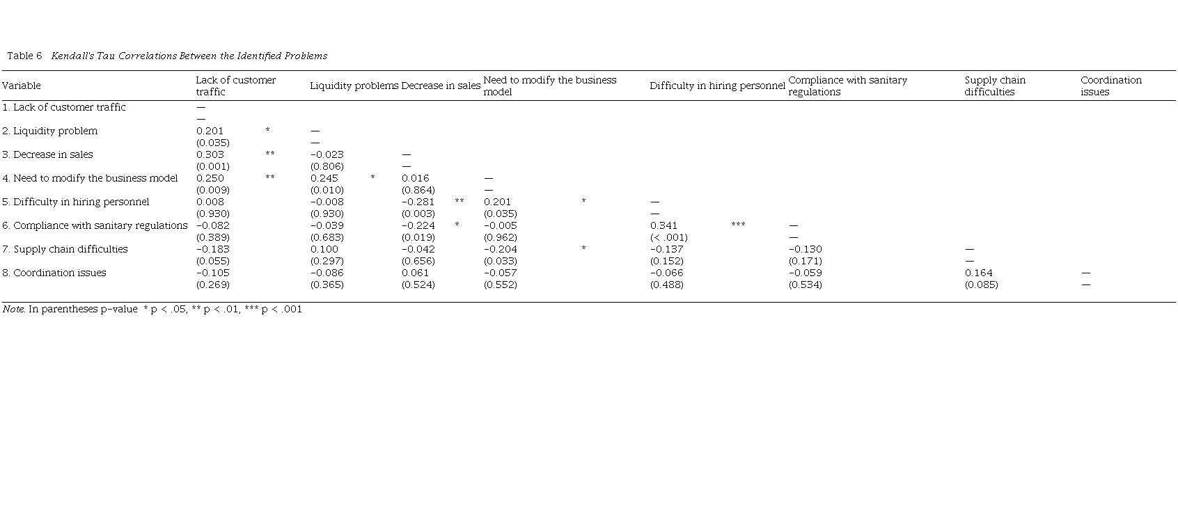 Table 6 shows the associations between eight variables, representing the challenges Peruvian gastronomic companies faced during the COVID-19 pandemic (detailed in Table 2). These associations are calculated using the Kendall-Tau methodology, a non-parametric correlation measure.