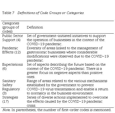 The qualitative analysis considered 42 primary codes, subsequently grouped into five categories, as shown in Table 7. The highest number of primary codes is observed in the categories of strategies followed by entrepreneurs and pandemic effects, with a total of 17 and 12 codes, respectively. Among the strategies, a change in the business model towards delivery stands out, as well as negotiations regarding lease agreements for rented locations and the activation of social media. In the case of effects, there is an agreement with the aspects analyzed in the quantitative section, such as reduced sales, decreased workforce, customer issues, logistical problems, and more. Table 7 presents the definitions of code groups or categories used to analyze the survey data. The code groups or categories refer to the themes or concepts that emerged from the content analysis of respondents' answers.