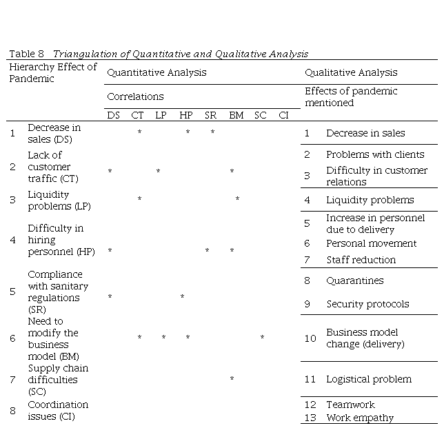 To link the quantitative results with the qualitative results, a triangulation of the effects caused by the pandemic was carried out. The multiple-choice question about the effects of the pandemic was compared with the coding of the open question of the survey referring to providing free comments about the pandemic. The results are shown in Table 8. It can be seen that the eight effects included in the survey were explicitly pointed out in the complimentary comments. Therefore, it can be considered that these effects have been transversal at a global level. Two statements (lack of traffic of clients and difficulty in hiring personnel) were not mentioned in the same way, but when coded, they were related to those themes. Therefore, they were included as similarities.