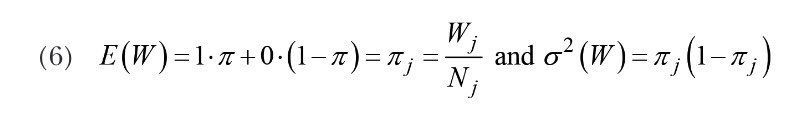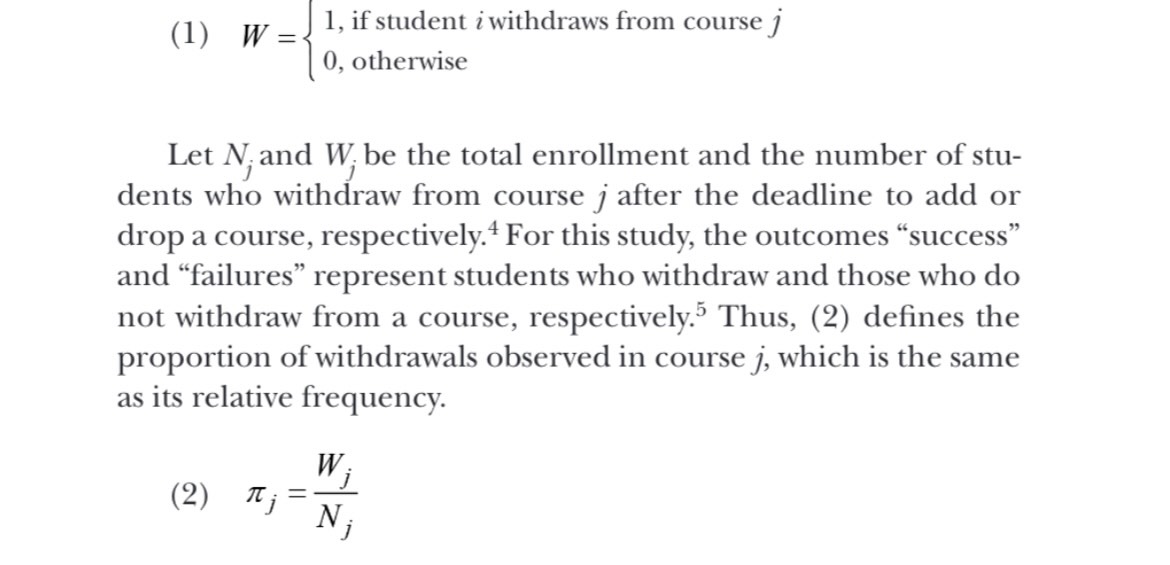 Usually, the determination of the number of total courses offered by academic fields (AFs) and the number of students enrolled in each one occurs at the beginning of each term. Likewise, by the end of the term, each academic department head knows with certainty the number of students who withdraw from each course and those who remain in it. Suppose each academic unit adopts a coding system such that code “1” represents the students who withdraw and code “0” represents those who do not withdraw. Thus, expression (1) defines the random variable W.