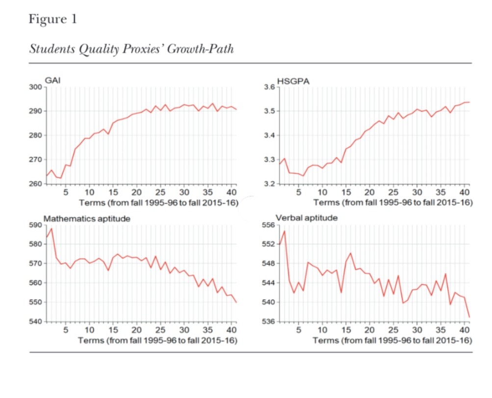 Figures 1 and 2 clearly depict the growth path of the student quality proxies and the four parameters under study. Four proxies account for student quality at the course level: GAI (see footnote 1), HS-GPA, mathematics, and verbal aptitude. Although GAI tends to increase over time, it should be mentioned that such a tendency is pushed by the self-sustained growth path of HS-GPA, which tends to increase over time (implying grade inflation). However, according to mathematics and verbal aptitude figures, student quality decreases over time. It should be mentioned that this decreasing tendency is consistent with empirical evidence documented at the international level, particularly evidence from Norway.10 Given that, on average, students are academically less able each term, two results should be expected by course: dimin-ishing GPA and increasing π