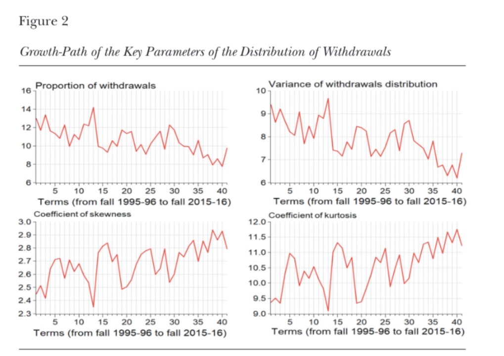 This study contributes to the extant literature by (a) being the first to analyze in detail the distribution of withdrawals and its key moments at the course level, (b) using a rich panel data comprising all courses offered at UPR-Bayamón during 41 consecutive terms, (c) including time-varying variables describing in detail the faculty characteristics, and showing that courses, faculty and students characteristics exert strong and significant effects on the estimated models, and (d) presenting empirical evidence pointing to the conclusion that faculty and students engage in a symbiotic relationship where both parties improve their well-being at the expense of diminishing academic standards.