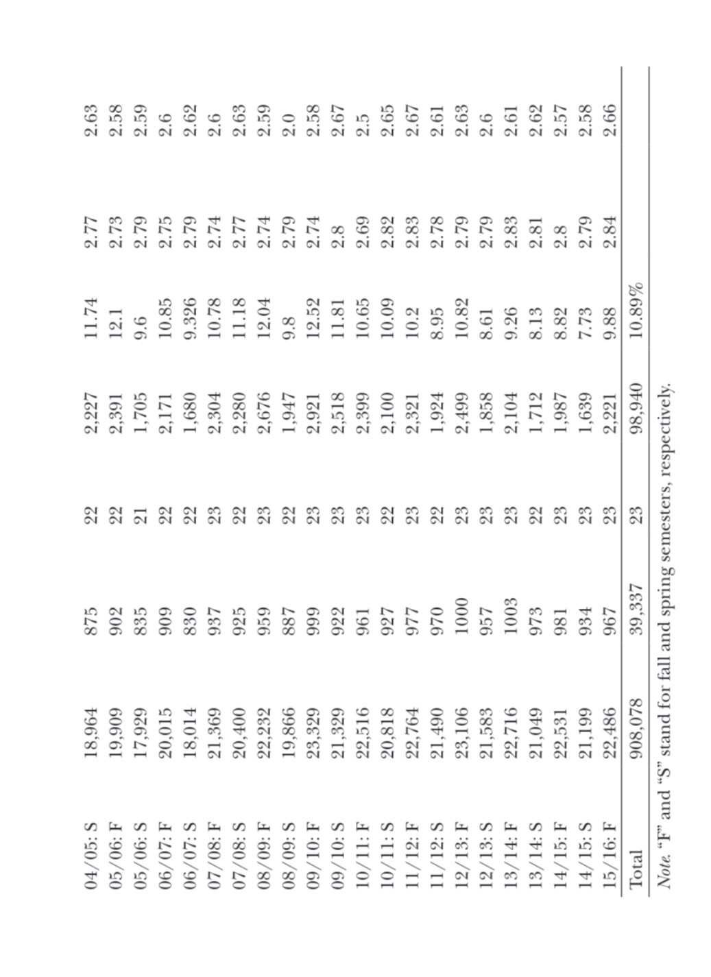Thus, the role of the ideal test described earlier has been ascribed to the GAI. The issue to be settled is whether the GAI satisfies conditions (a) and (b)previously mentioned. Of course, the answer is no. Because of the inaccuracies of GAI, there are several endemic academic problems whose incidence varies among and within the eleven UPR campuses. For instance, to be admitted to the UPR at Bayamón (UPR-Bayamón), many students whose GAI is below the minimum apply to non-desired programs for which they qualify, looking for an eventual possible transfer to their desired program. The strategy consists of enrolling in courses in their desired program even though they are officially admitted to a different one. Because the academic requirements and contents of the programs could differ significantly, the likelihood of course failures and withdrawals increases. Moreover, such a strategy lengthens time until graduation, increasing the opportunity cost of schooling. Eventually, many such students withdraw from the institution because of failure to be admitted to their desired programs. Furthermore, it should be mentioned that these endemic problems are also prevalent even among students who were admitted to their desired programs from the beginning. Therefore, the official admission policy generates undesirable by-products like academic failures, too many applications for program transfers, as well as total and partial withdrawals. Among these problems, this study seeks to analyze the distribution of withdrawals (W) observed in the 39,337 courses offered during 41 consecutive terms (including summer sessions) at UPR-Bayamón from fall 1995-96 to fall 2015-16. To the best of my knowledge, the extant literature lacks studies devoted to analyzing the implications and consequences of the proportion of course withdrawals on the education process; this paper seeks to fill such a gap.