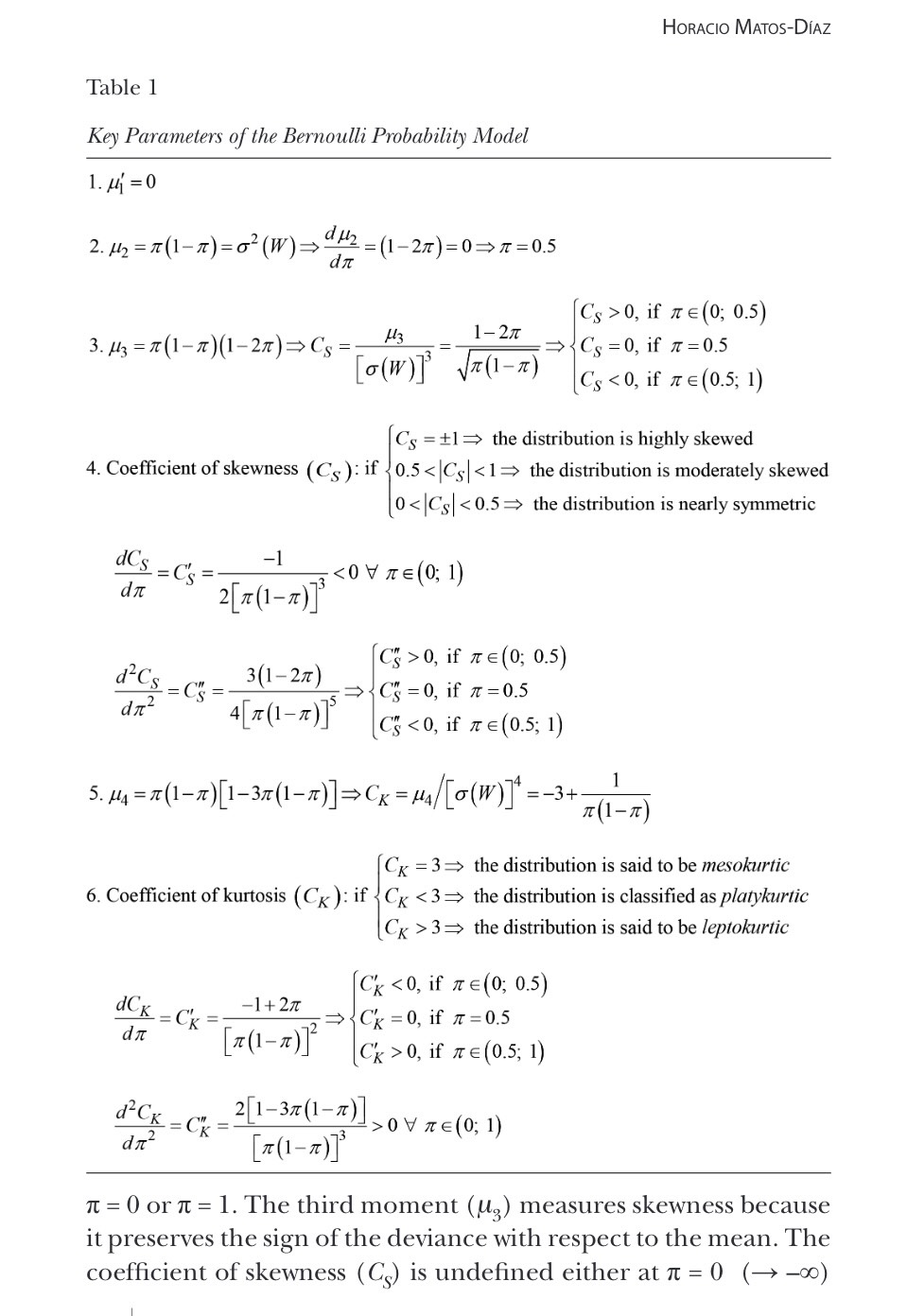 .The first moment around the origin is equal to π. This calculation requires taking the first derivative with respect to t (evaluated at t = 0) from the corresponding moment-generating function.[6] The superior moments around the origin are all equal to πThe first moment around the origin is equal to π. This calculation requires taking the first derivative with respect to t (evaluated at t = 0) from the corresponding moment-generating function.6The superior moments around the origin are all equal to π. How-ever, moments around the mean are more interesting. Let μ1,μ2,μ3, and μ4 be the first four moments around the mean. To find them, it is necessary to take the first, second, third, and fourth derivatives with respect to t and to evaluate each one at t = 0; Table 1 reports their values, as well as the coefficients of skewness (CS) and kurtosis (CK). The units of measurement of μ3 and μ4 influence their respective size. Therefore, considered alone, they are poor measures of skewness and kurtosis, respectively. Such dimensionality disappears, defining each coefficient as a relative measure, as done in (