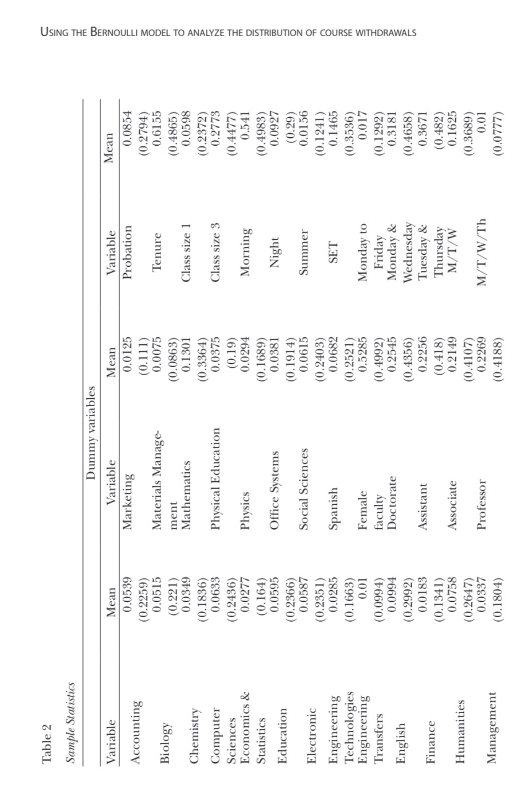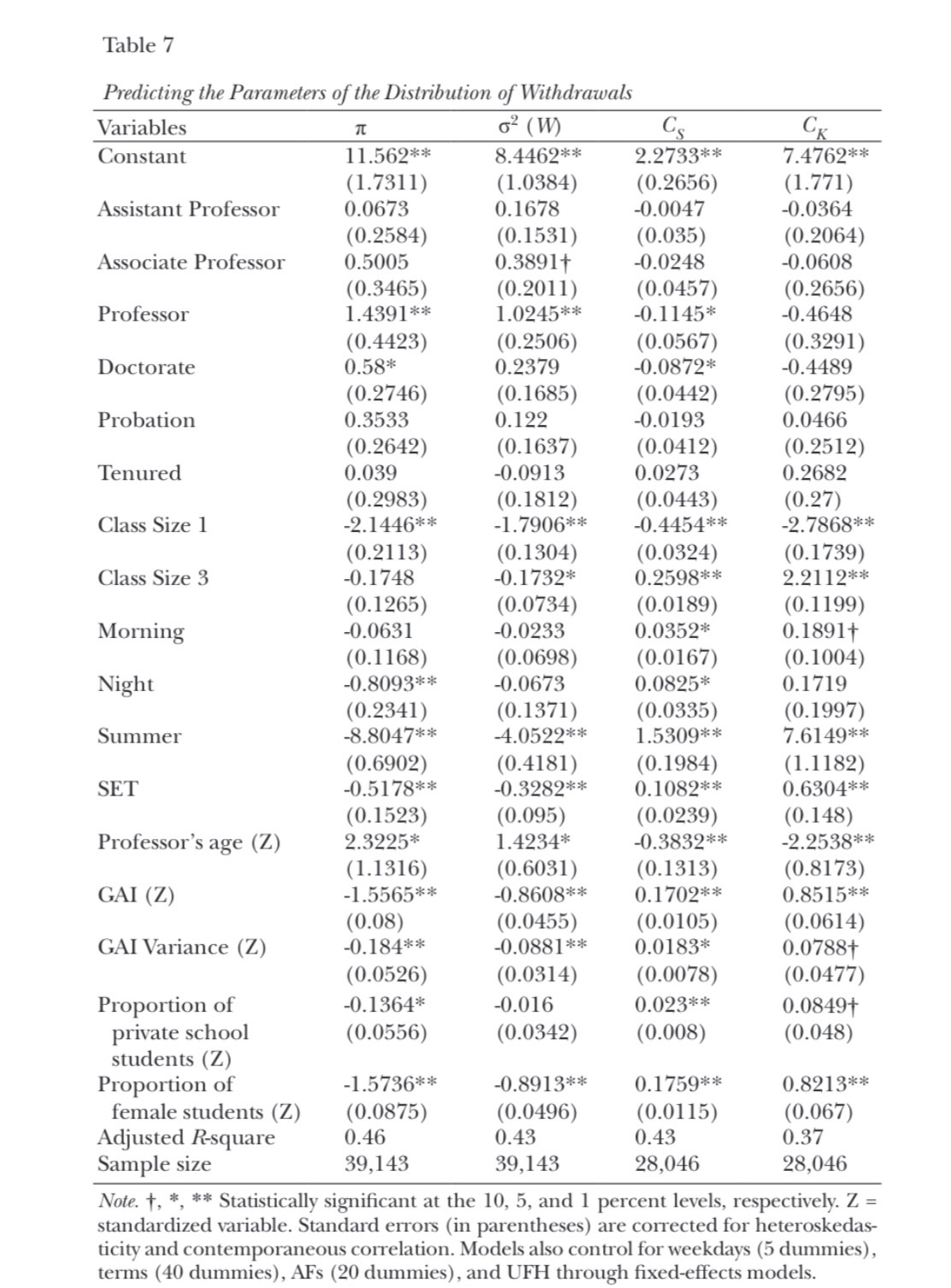 To this end, this paper adopts the Bernoulli probability model and derives the moment-generating functions around its origin and mean. For each course, the objective is to calculate the following four parameters: first, the proportion of withdrawals, which equals the first moment around the origin; second, the variance of its distribution, which is equal to the second moment around the mean; third, the coefficient of skewness, using the third moment around the mean; and fourth, the coefficient of kurtosis, using the fourth moment around the mean. Using different econometric specifications, including random- and fixed-effects models, allows the modeling of these four parameters. This paper uses a rich and detailed panel data containing time-varying variables describing faculty, student, and course characteristics to fulfill this objective.