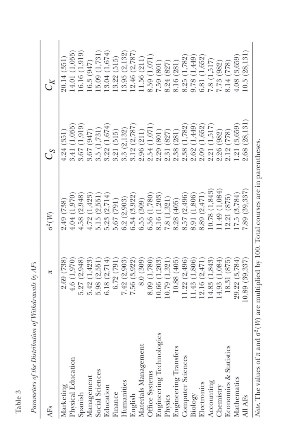 to the right and leptokurtic distributions. However, there are 194 courses where 0.49 <π < 0.51. For all of them, σ2(W) reaches its absolute maximum (0.25). Furthermore, CS tends to zero, im-plying symmetric distributions; while CK tends to one, implying platykurtic distributions. A total of 106 (≈ 55%) of those courses belongs to Mathematics. Thus, to the extent that π tends to zero, CS and CK increase unbounded implying distributions exhibiting higher skewed to the right and greater leptokurtosis degrees, respectively. Finally, there are 686 courses where π > 0.5; out of this number, 465 (≈ 68%)belong to Mathematics. On the other hand, there are 11,206 courses where π = 0, but only 125 (1%) be-long to Mathematics. Thus, according to student withdrawal decisions, Mathematics courses are the most difficult, independent of the criteria used to measure difficulty