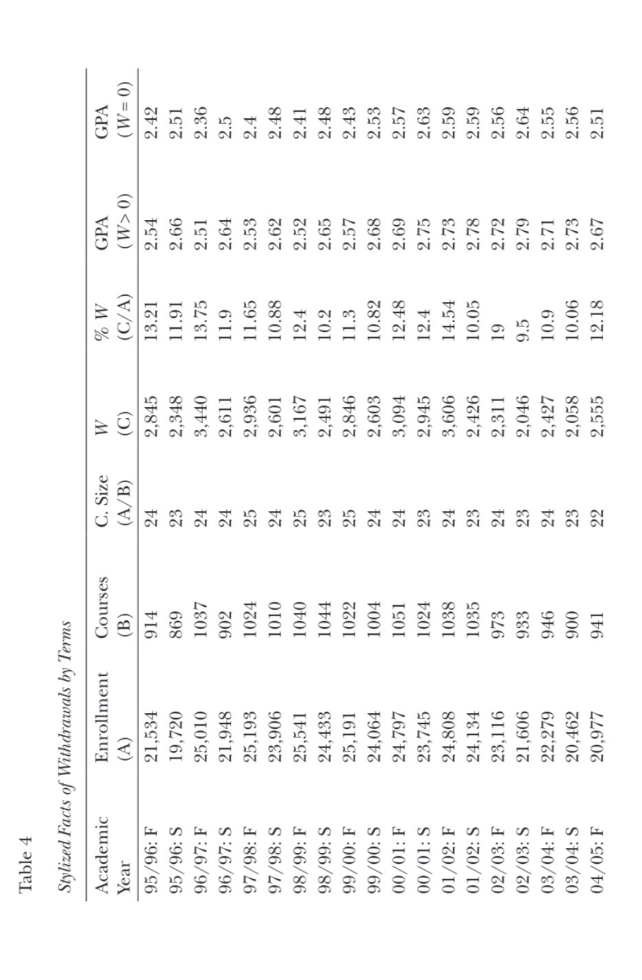 The last two columns of Table 4 report the GPAs for the full sample (39,337 courses), as well as the GPAs for the subsample where W > 1 (28,131 courses) distributed by terms. Each GPA in the first column is greater than its counterpart in the second one, and both series increase over time, implying grade inflation since simultaneously, student quality is diminishing. On the other hand, during the forty-one terms studied, the overall π is 10.89%. As shown in the sixth column of Table 4 and clearly depicted in the first graph of Figure 1, π decreased over time, from 13.21% in the fall 1995 term to 9.88% in the fall 2015 term. Therefore, contrary to what should be expected, evidence points to increasing GPAs and decreasing π.11