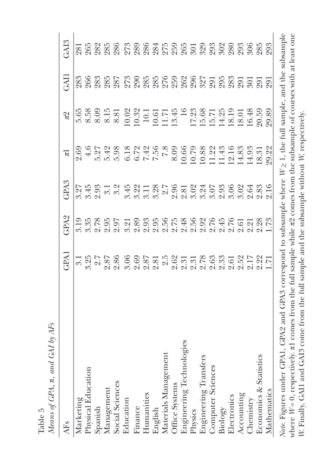 It should be emphasized that this inverse relationship be-tween GPA and π documented across time is a robust one observed among and within AFs. Table 5 reports the evidence. Once again, AFs are ordered using the values of π, from smallest to largest, as reference. Conversely, the respective GPAs reported in the three columns run from largest to smallest. Moreover, for each academic field, the GPAs observed in courses where W> 1 is lower than the respective one observed in the full sample, where W> 0, which in turn is lower than the one observed in courses where W = 0. Therefore, either over time or between and within AFs, GPA and π move in opposite directions. This result is at odds with that reported in the extant literature (Matos-Díaz, 2018). Figure 2 also depicts the growth-paths of σ2 (W) CS, and CK. Like π, σ2 (W) decreases over time. Conversely, CS and CK exhib-it an increasing tendency over time. Thus, the distributions of course withdrawals become more skewed to the right and more leptokurtic, implying greater academic homogeneity among and within courses over time.