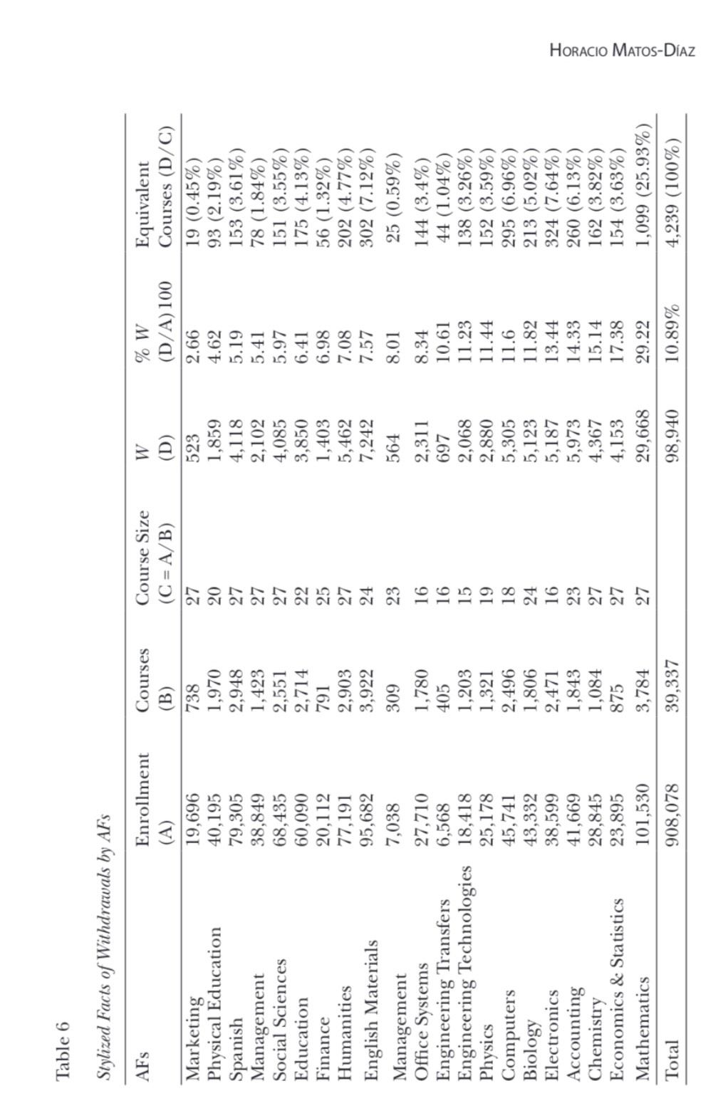 Table 6 reports several key facts of π by AFs. The service de-partments responsible for offering the highest number of courses were English (3,922), Mathematics (3,784), Spanish (2,948), and Humanities (2,903). The value in Mathematics was the greatest (29.22%), while the respective figures in the English, Humani-ties, and Spanish courses were 7.57%, 7.08%, and 5.19%. Two other service programs exhibiting high π values were Economics & Statistics (17.38%) and Chemistry (15.14%). The last column of Table 6 transforms withdrawals (W) into equivalent courses by AFs. The exercise requires dividing each value of W by the aver-age course size of the respective AFs. The total W (98,940) observed during the period would require offering 4,239 equivalent courses to satisfy future demand.