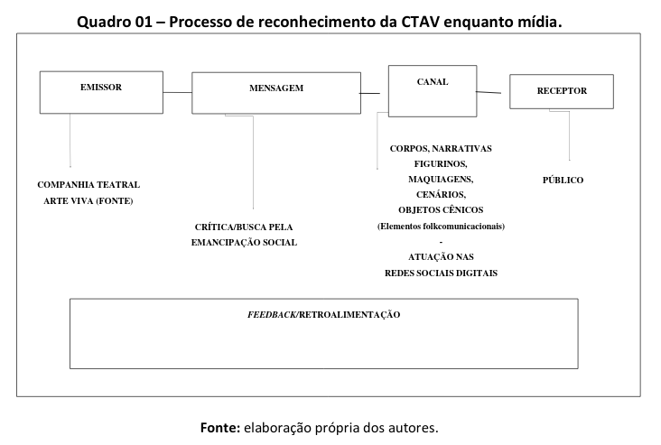 Diante do exposto, visualizamos o aspecto mediador da companhia enquanto elaboradora do processo comunicacional midiático a partir do esquema simplificado do quadro 01. Este exprime a intenção levada ao público através da emissão proporcionada pela CTAV das mensagens de caráter social por meio do canal simbolizado pelos corpos, narrativas, figurinos, maquiagens, cenários e objetos cênicos no qual se constitui a companhia, visando o público como alvo do processo, possibilitando ainda a retroalimentação, a partir do fluxo mútuo de informações.