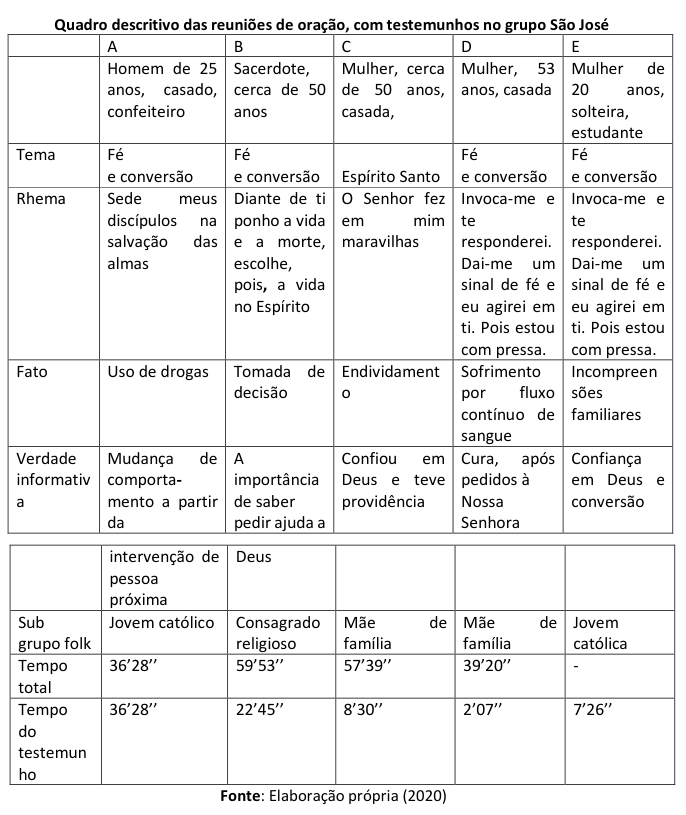 Para descrever os testemunhos observados na comunidade escolhida como grupo folkcomunicacional, elaborou-se primeiramente um quadro resumo com criação de categorias que permitem analisar o fenômeno dos grupos de oração como meios de comunicação popular, problematizando-se o que seriam verdades informativas. Como categorias comparáveis foram elaboradas as seguintes: