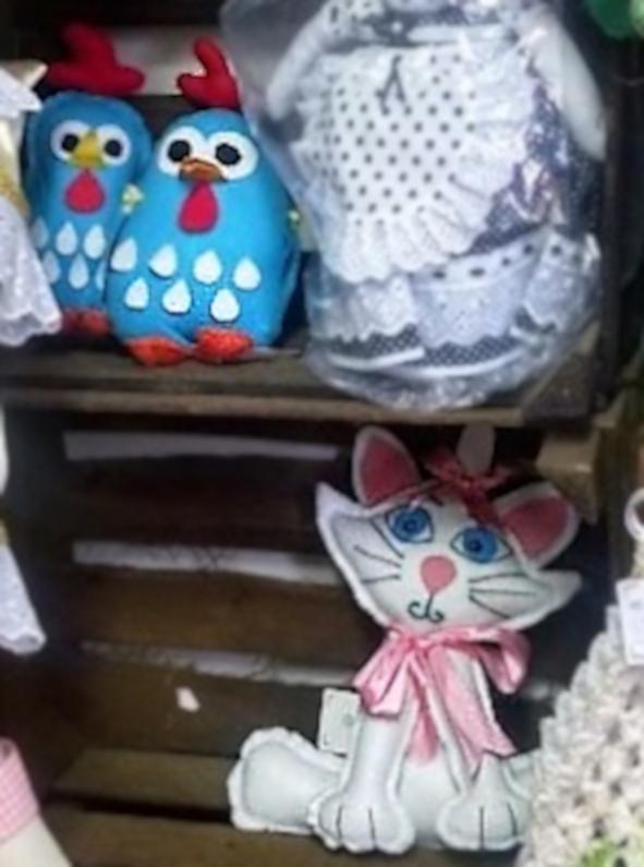 As peças que conjugam e mesclam traços midiáticos, mas sem vinculação imediata são aquelas nas quais há a incorporação de traços aprendidos via contatos midiáticos. Nelas, as artesãs mesclam traços facilmente identificáveis de alguns personagens em outras aplicações não correlatas, incorporando esses repertórios no seu fazer. Violeta explica que procura inspiração e conhecimento para adornar suas peças: “Muitas vezes eu pego um detalhe, às vezes eu pego o biquinho, a crista, às vezes uma galinha, uma coruja... esses detalhes eu tiro da internet, das revistas”. Um dos exemplos mais marcante disso são os olhos arredondados da Galinha Pintadinha que vêm sendo reproduzidos em diversos tipos de galinhas e corujas, sem qualquer menção mais explícita à origem do traço.