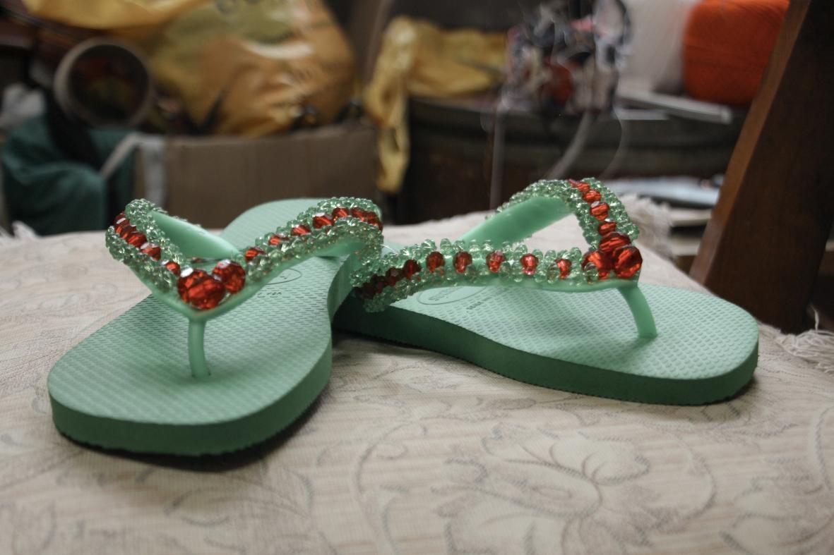 E, por fim, as peças criadas a partir de aprendizagens midiatizadas são aquelas que foram elaboradas por meio de aprendizagens conquistadas pelo contato com outras artesãs por meio de redes sociais digitais como Pinterest, Facebook, Instagram e YouTube. Tais peças são incorporadas ao repertório da artesã e adaptadas ao seu estilo e saberes locais, sem configurarem-se como “cópias” ou mera apropriação de moldes. Amarilis recorda que sempre gostou muito de bonecas, mas não sabia fazê-las. Ela relata que aprendeu a costurá-las pelo contato com uma artesã de Pernambuco, pelo Facebook. Ao ser perguntada sobre como estabeleceu esse contato, ela respondeu: “Fuxicando no celular até encontrar”. As peças dessa categoria são dificilmente localizáveis sem um diálogo estreito com as artesãs. Tais peças são variadas, compreendendo produtos e técnicas, como bonecas de pano e pontos de crochê. No caso trazido na imagem abaixo (figura 5) temos um chinelo com miçangas, aprendido por uma artesã em um tutorial no YouTube.
