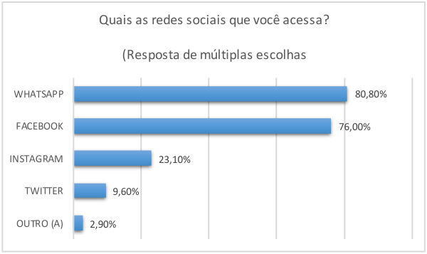 Por sua vez, o Instagram é acessado por 23,1% dos entrevistados, que disseram usar o Instagram, uma rede social gratuita, para postar fotos e vídeos que podem ser visualizados pela rede de amigos. Por fim, 9,6% afirmaram usar o Twitter, que também é uma rede social gratuita a qual funciona como um microblogging, permitindo postar fotos e textos.
