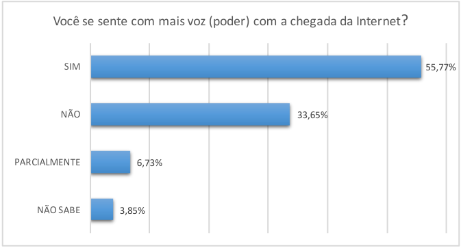 Nesse sentido, 55,77% dos moradores do distrito de Calama afirmaram que se sentem com mais voz (poder) ao utilizar o acesso à Internet para expor suas necessidades.