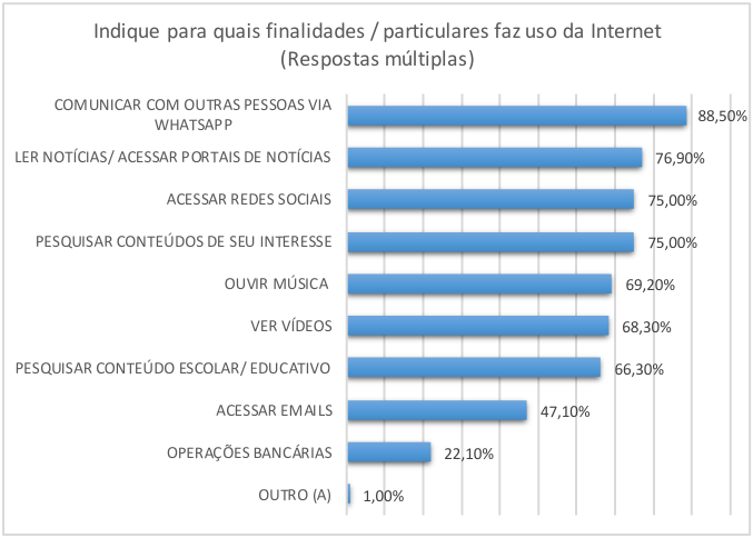 Dos entrevistados, 76,9% acessam para atualizar-se com as notícias locais, nacionais e internacionais; outros 75% para entrar nas redes sociais, dentre elas, o Facebook, Instagram e Twitter. Há também relatos de que o envio e recebimento de cartas diminuíram, pois 47,1% usam o e-mail como forma de se comunicar.