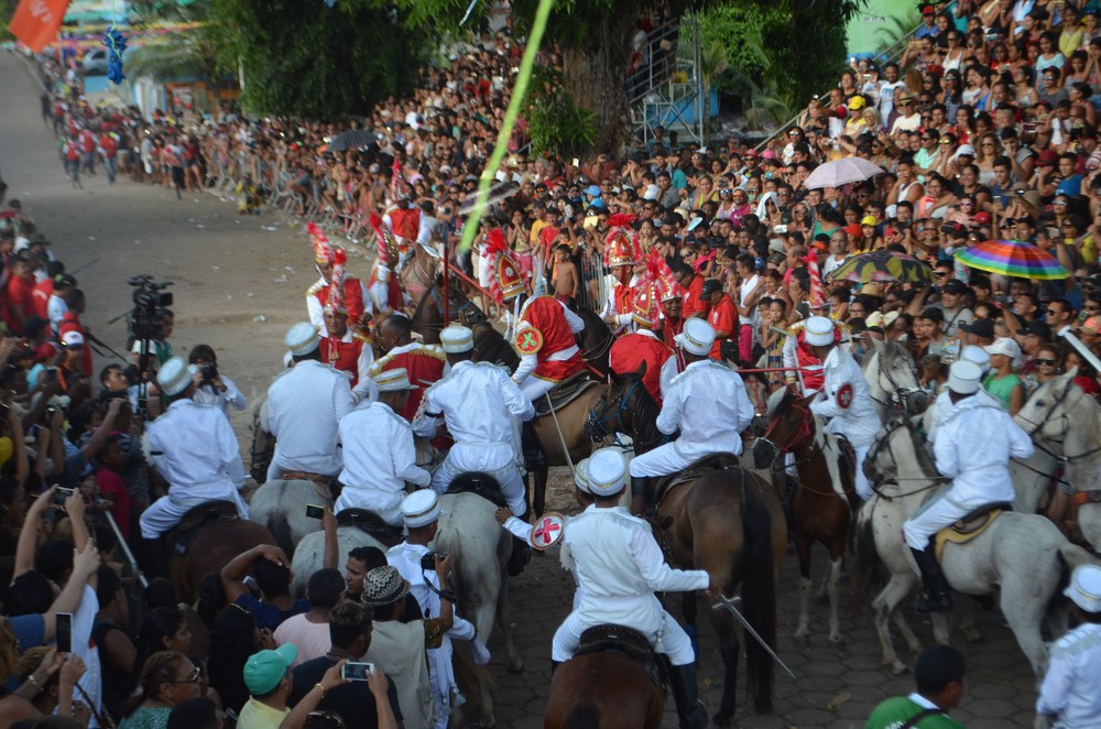 A Festa de São Tiago mistura cavalhada⁹, sincretismo religioso e teatro, no período de 16 a 28 de julho. O ponto alto na programação do evento acontece no Dia de São Tiago, em 25 de julho, com missa campal, círio e encenação teatral da guerra entre mouros e cristãos. “Os preparativos para a Festa de São Tiago consomem algumas semanas e essa preparação envolve todos os moradores, os quais são os protagonistas da festa” (PASTANA, 2017, p. 62).