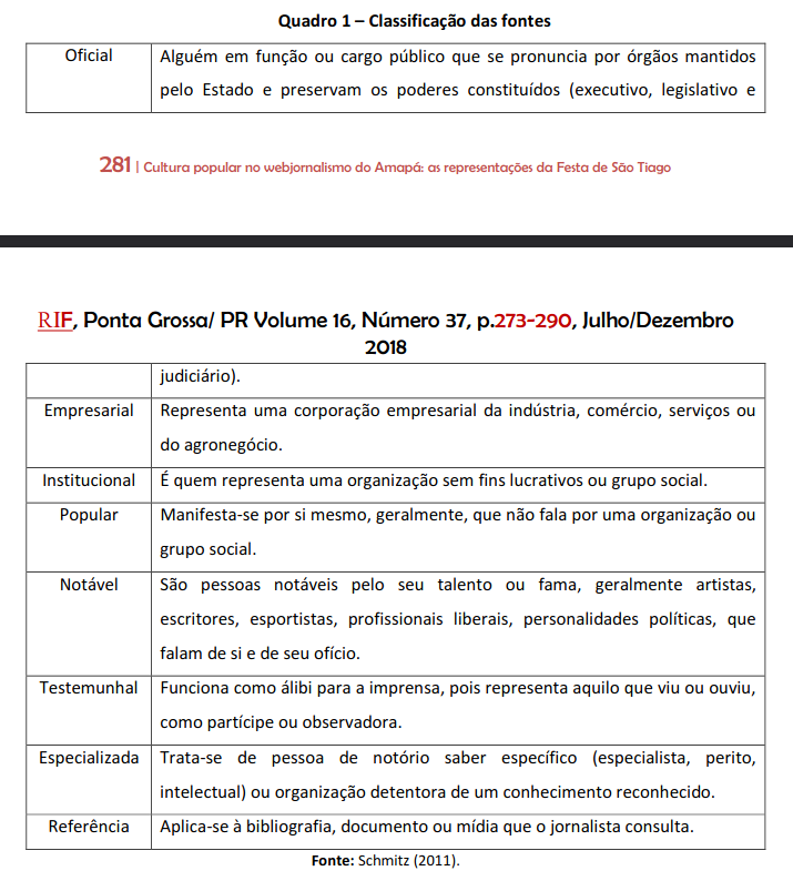 O artigo pretende descrever de que forma os atores envolvidos com a Festa de São Tiago são representados no webjornalismo do Amapá. Para fazer a referida identificação, nos baseamos na sistematização das fontes de notícias categorizadas por Schmitz (2011): especialista, referência, testemunhal, institucional, notável, empresarial, oficial e popular. O quadro a seguir demonstra o conceito de cada classificação: