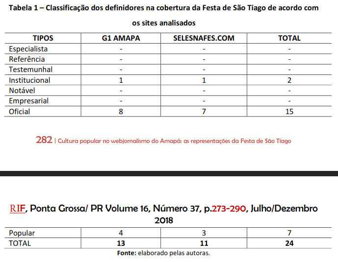 Portanto, no período de 1º a 31 de julho de 2017, levantamos 20 conteúdos que se referem direta ou indiretamente à Festa de São Tiago, sendo 10 do portal G1 Amapá e 10 do SelesNafes.com. Destes, segundo as tipologias de Schmitz (2011), 17 apresentam um ou mais definidor como fonte, totalizando 24 definidores. Assim, nos sites analisados durante a cobertura do evento, constatamos a presença das classificações “institucional”, “oficial” e “popular”.